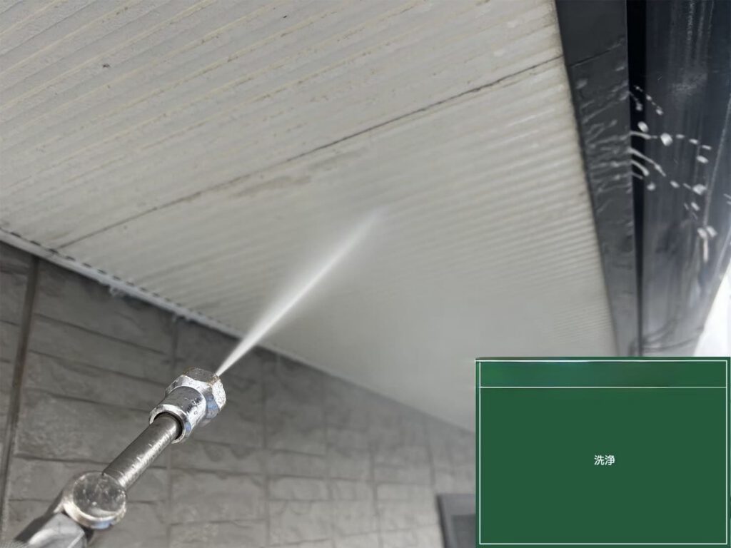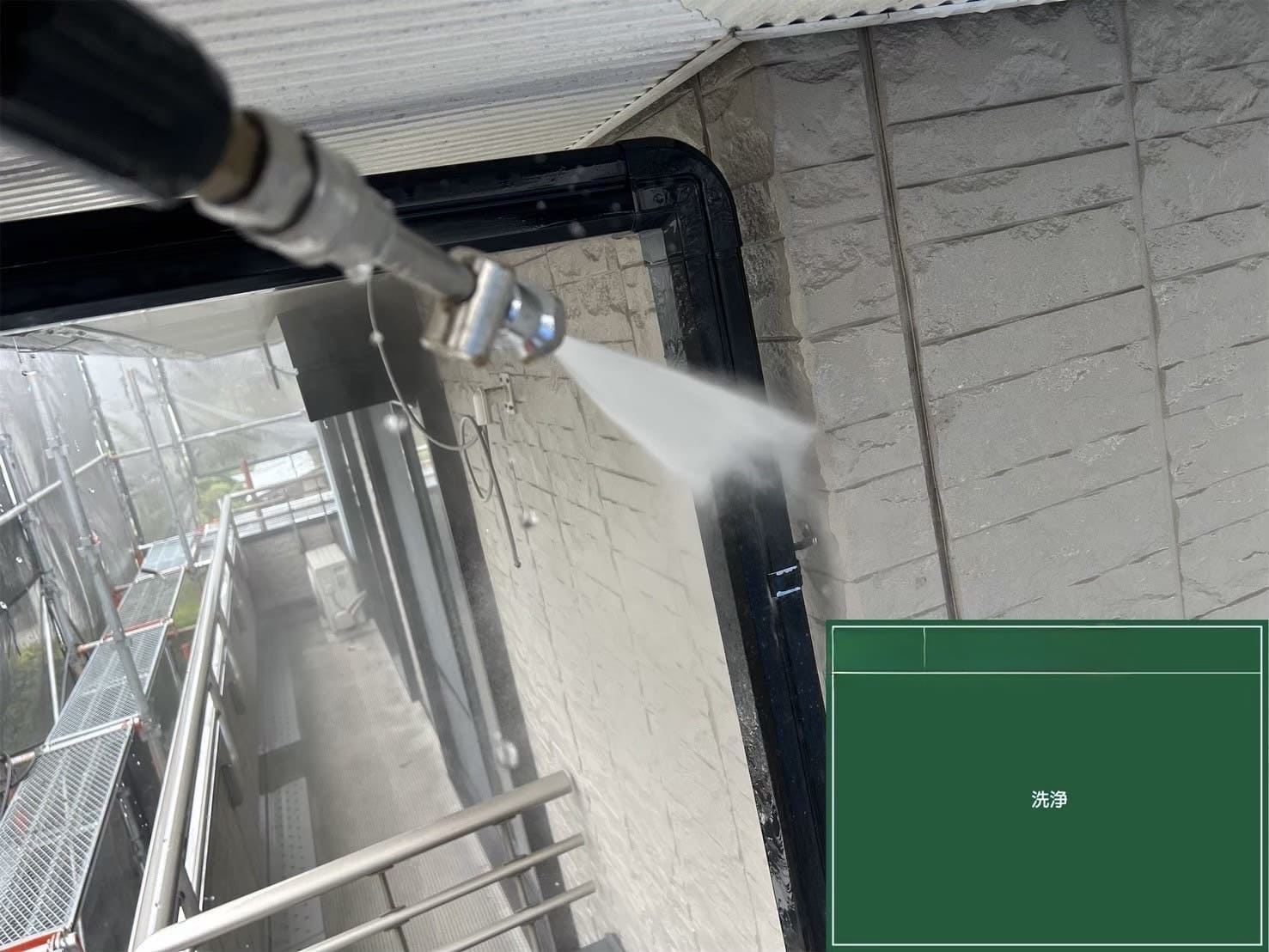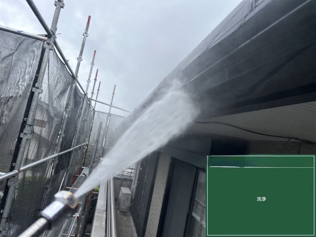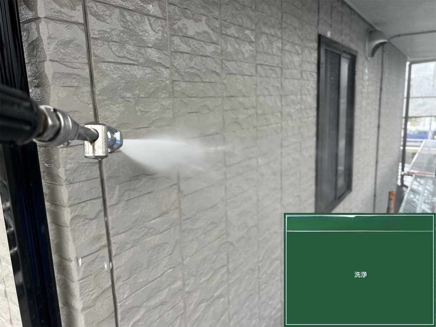 外壁のホコリやカビなどを高圧洗浄で落としていきます。