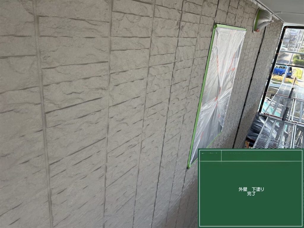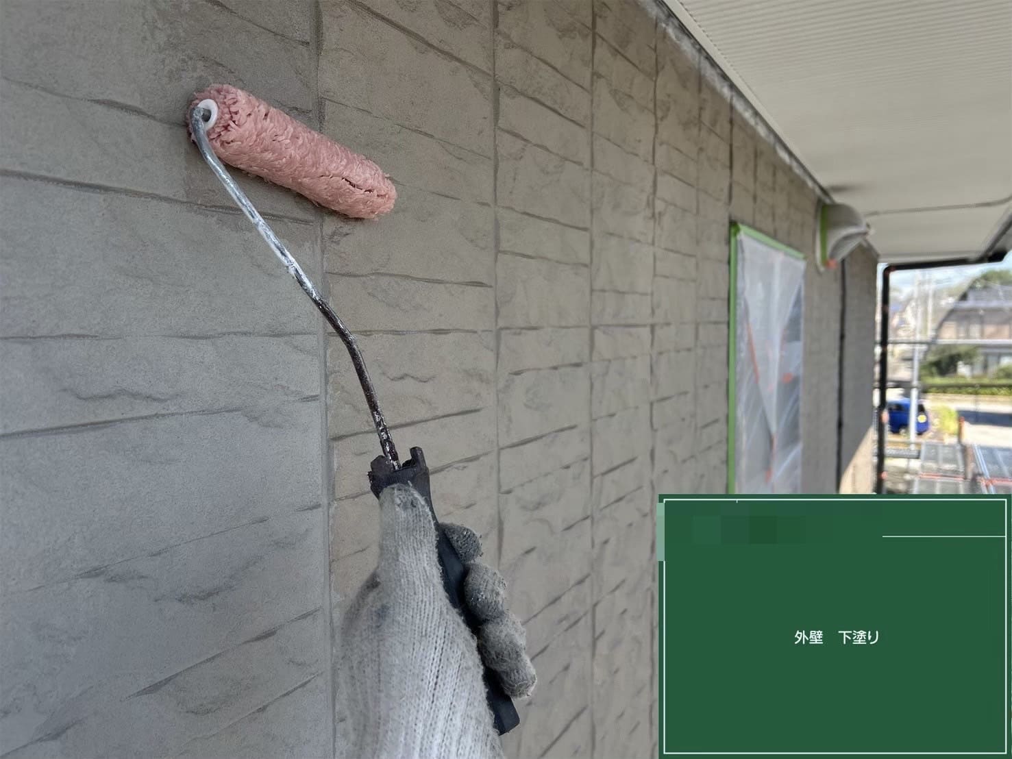 外壁の下塗り使用した材料はソフトリカバリーです。こちらの下地材は多種多様の外壁材に対応していて密着性がとてもいいです。